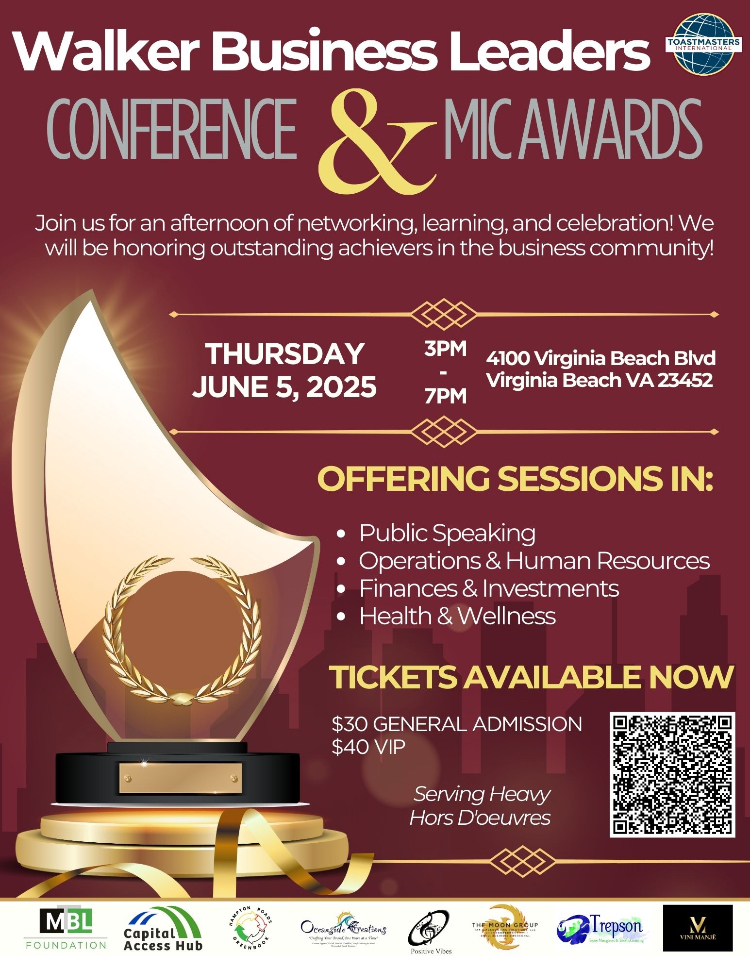 Welcome to the Walker Business Leaders Conference & MIC Awards! Join us for a day filled with insightful sessions, networking opportunities, and an evening celebrating the most innovative minds in the industry. The event will be held at 4100 Virginia Beach Blvd, where you’ll have the chance to connect with like-minded professionals and learn from top business leaders.